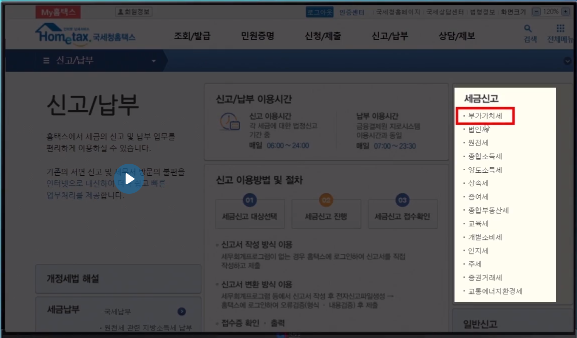 2. [신고/납부]- [부가가치세]를 클릭한다.