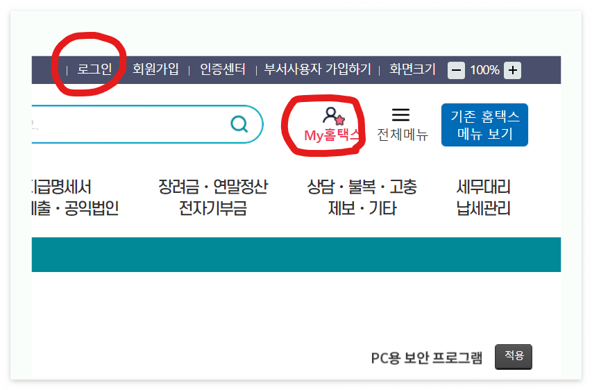 2. 우측 상단에 있는 [로그인]을 클릭하여 로그인을 하고 [my홈택스]로 이동합니다.