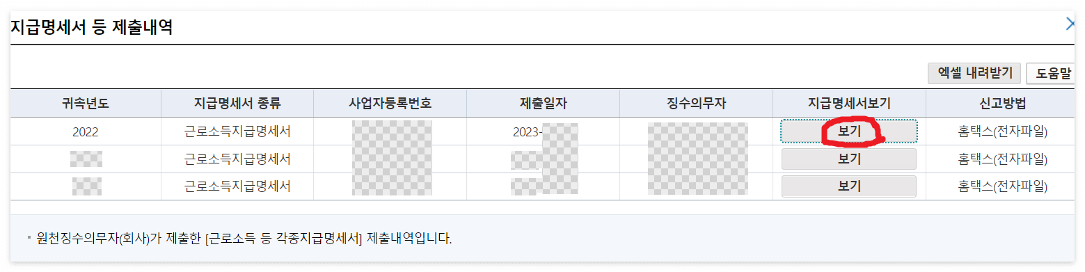 4. 귀속년도를 확인하고 지급명세서보기를 클릭합니다.