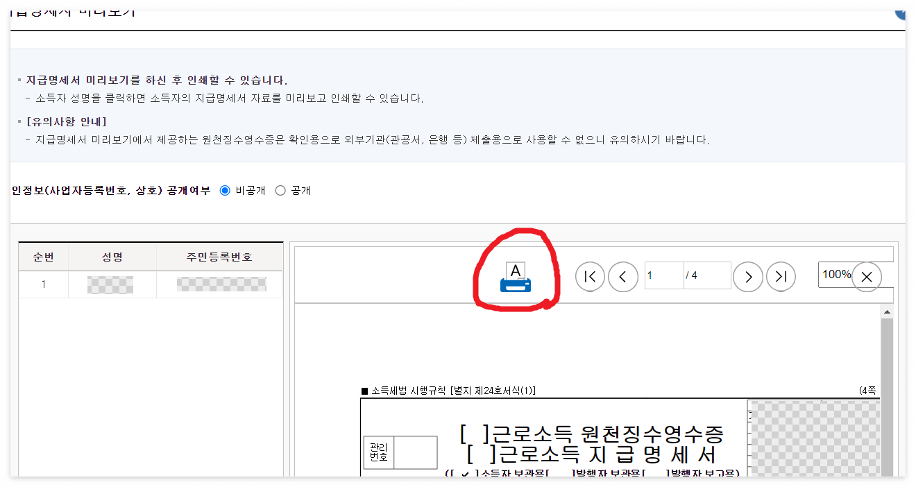 5. 지급명세서 미리보기에서 A 버튼을 누르면 pdf파일로 저장하거나 인쇄할 수 있습니다.