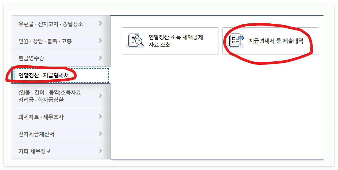 3. 좌측 하단으로 이동하여 [연말정산, 지급명세서] 메뉴를 클릭하고 우측으로 이동하여 [지급명세서 등 제출내역]을 클릭합니다.