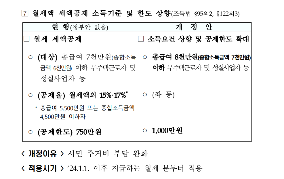 현재는 연간 총급여가 7천만 원, 종합소득금액은 6천만 원 이하인 무주택자만 월세 세액공제를 받을 수 있었는데요. 개정안에서는 총급여가 8천만 원, 종합소득금액은 7천만 원 이하인 무주택자로 소득기준이 상향되었습니다. 따라서 더 많은 사람들이 월세 세액공제의 혜택을 볼 수 있게 되었는데요.